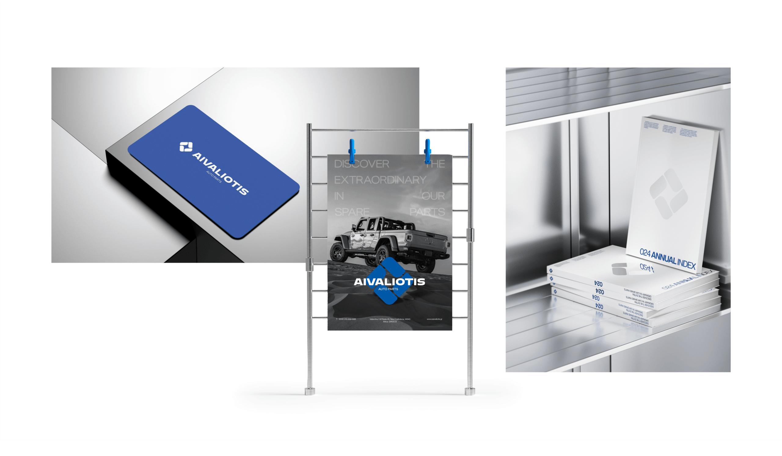 Aivaliotis S.A. has been importing and distributing automotive spare parts across Greece since 1964. The company came to us before Autotec 2023 with a clear objective: preserve the brandmark that sixty years had made recognizable, and rebuild everything around it. We refined the existing symbol, adjusting its geometry while maintaining its essential character. Around it, we constructed a complete visual system. Aegean Blue anchors the color palette.